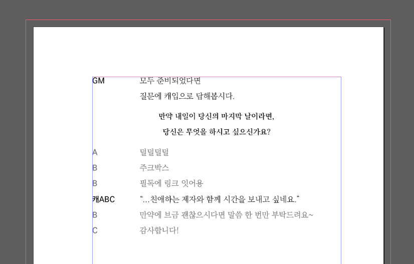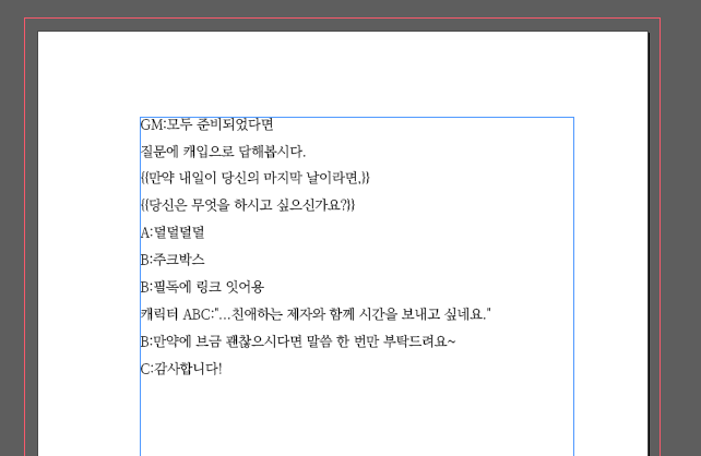 첨부 파일의 인디자인 파일을 다운로드 받습니다. 열면 첫 페이지만 있을 겁니다. 거기다 아까 복사해두었던 롤20 채팅 로그를 붙여넣습니다.